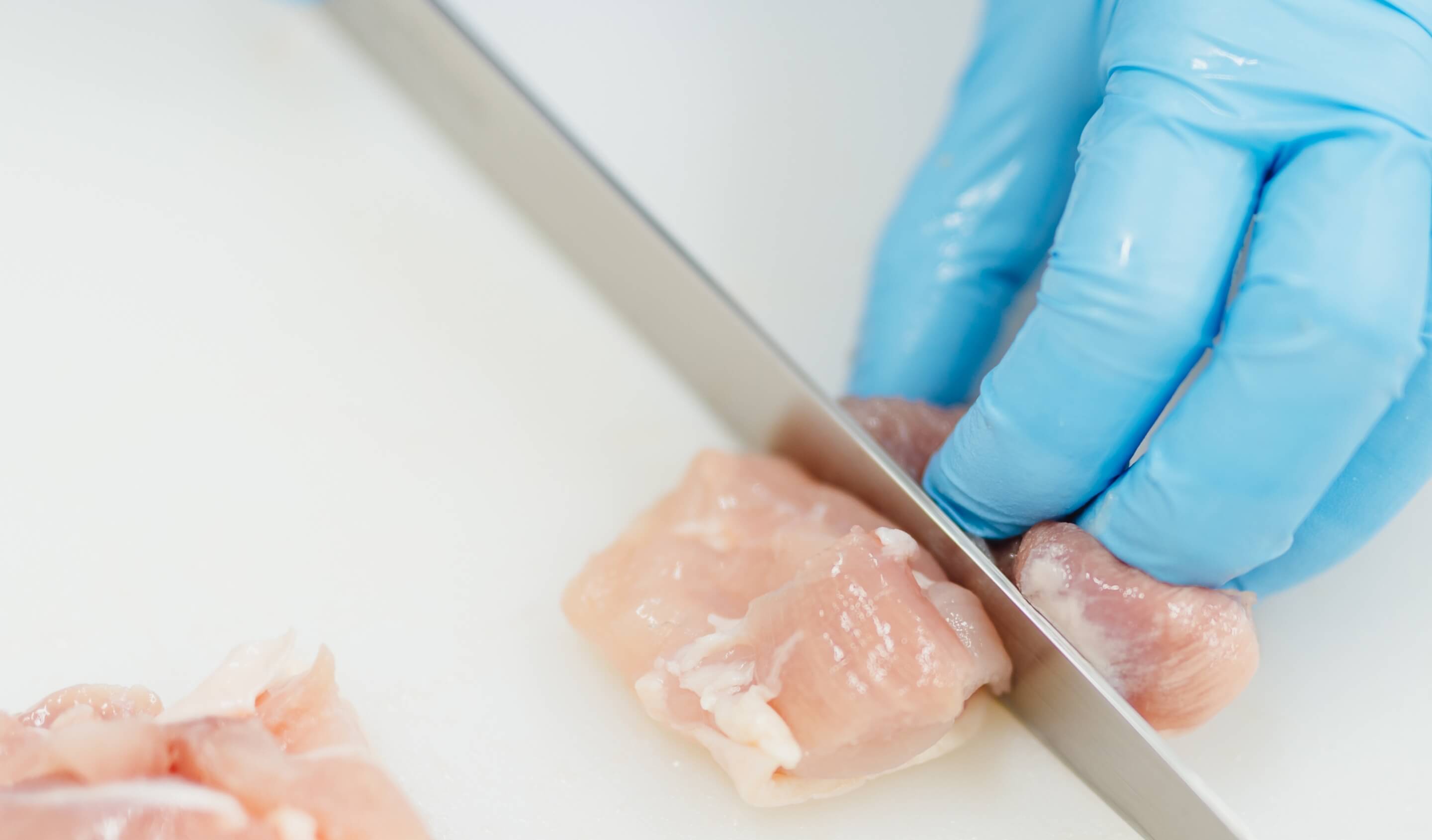 ナカガワフーズでは、機械によるカットのほか手切りによる生肉の加工を行っています。機械では加工が難しい小さなサイズの希少部位も、手切りでカット。